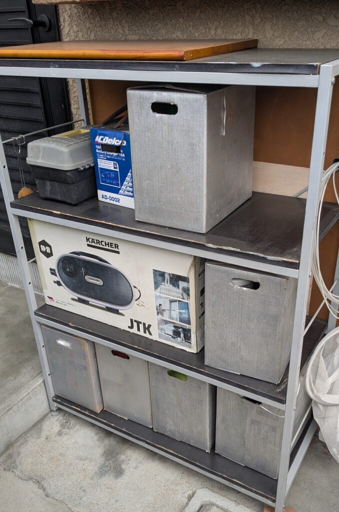 横に4つ並べ縦3段、工具や洗車用具….等々それぞれ纏めて整理
