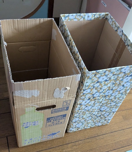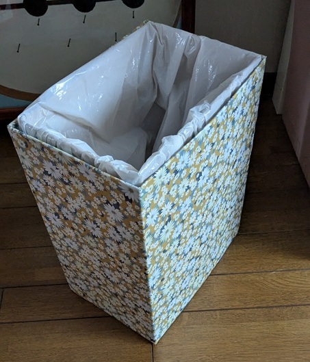 外箱はちょっと小マシな模様紙を貼ってゴミ箱でもゴミ箱ぽくない
