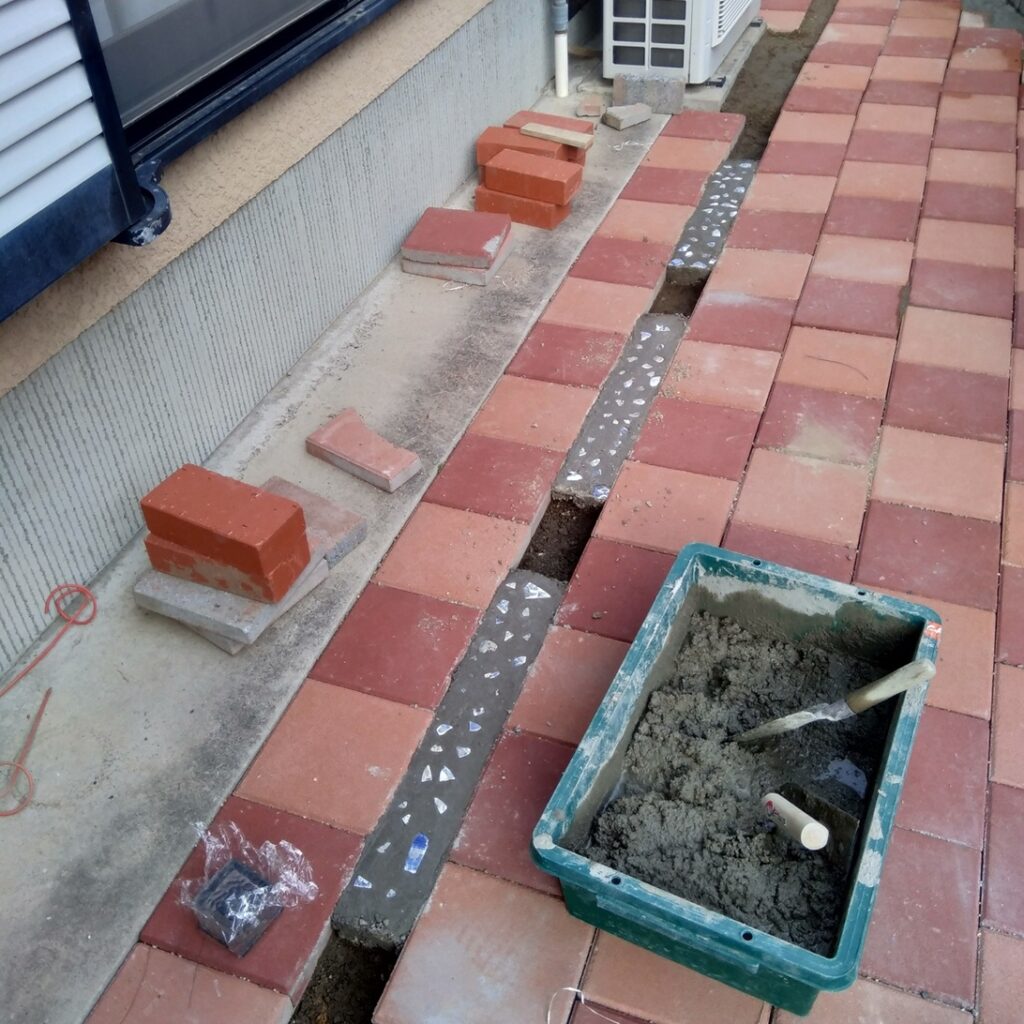 板敷きは家側から少しずつ並べる作業….ここで傾斜を付けることに気が付く😳