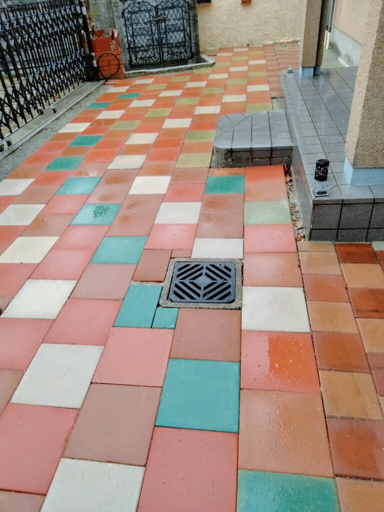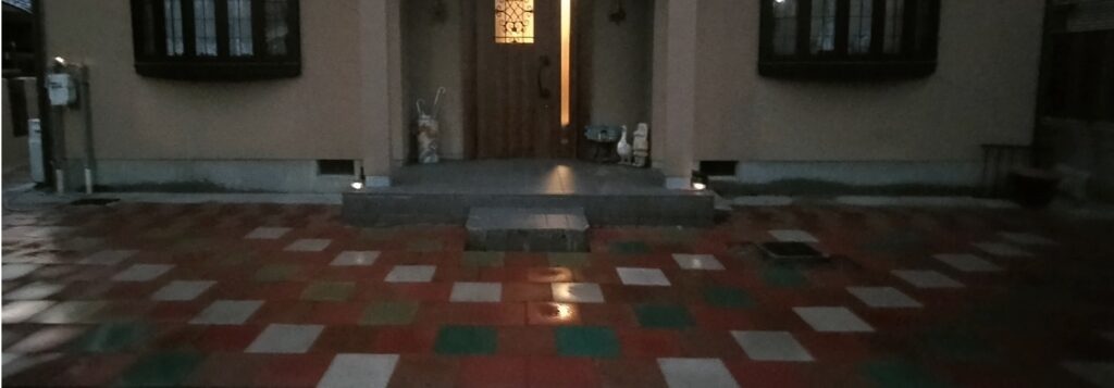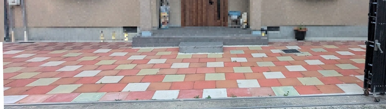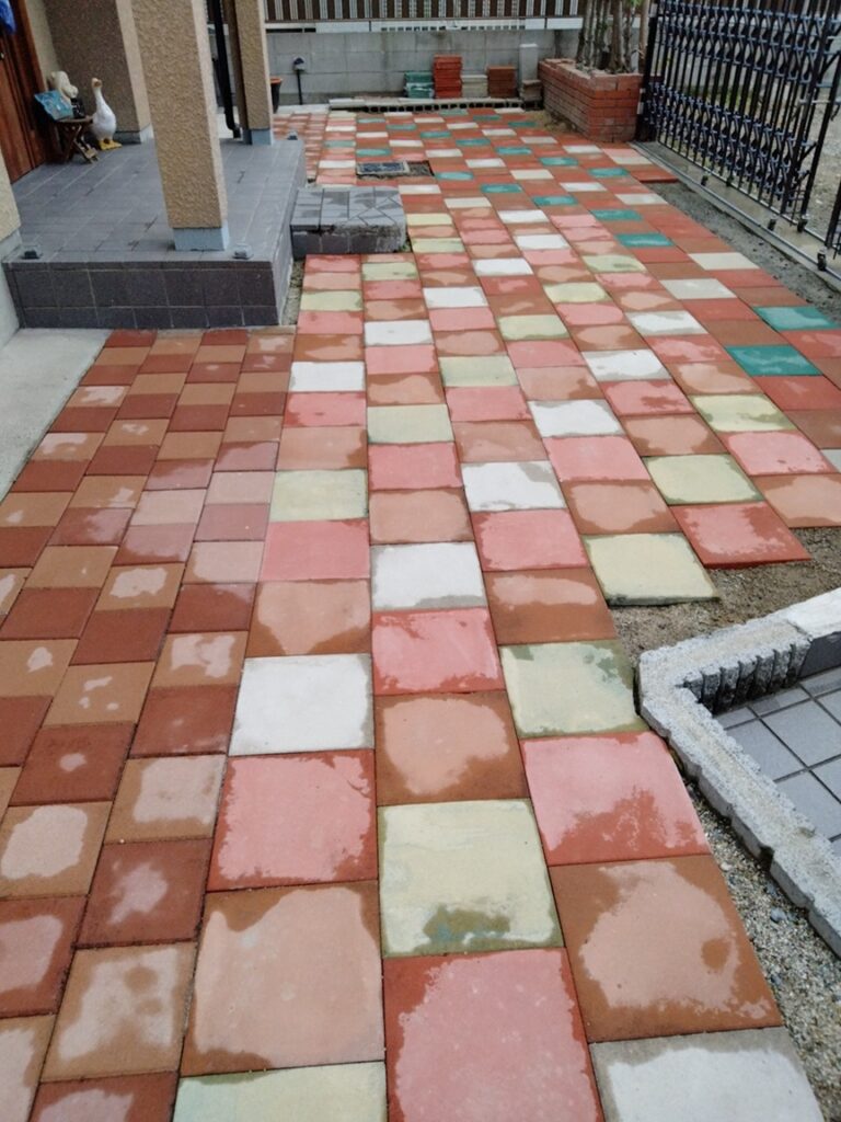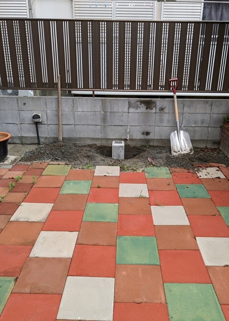 今回の敷板は前回南庭に使った20cm×20cmではなくメリハリを出すため東正面は×30cm×30cmのカラー平板で赤・茶・緑・ベージュの四色に決定